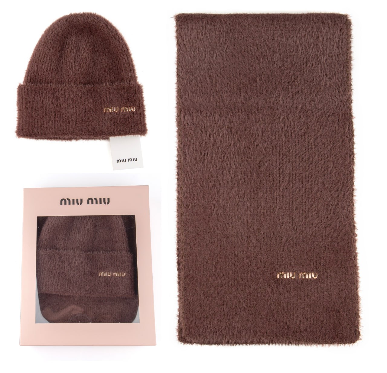 Miu Miu kadin atki bere takimi Gold Logo Detayli Yeni Sezon Kahve adet