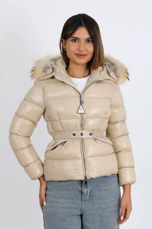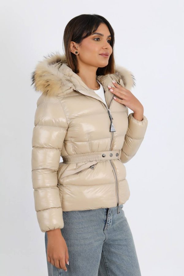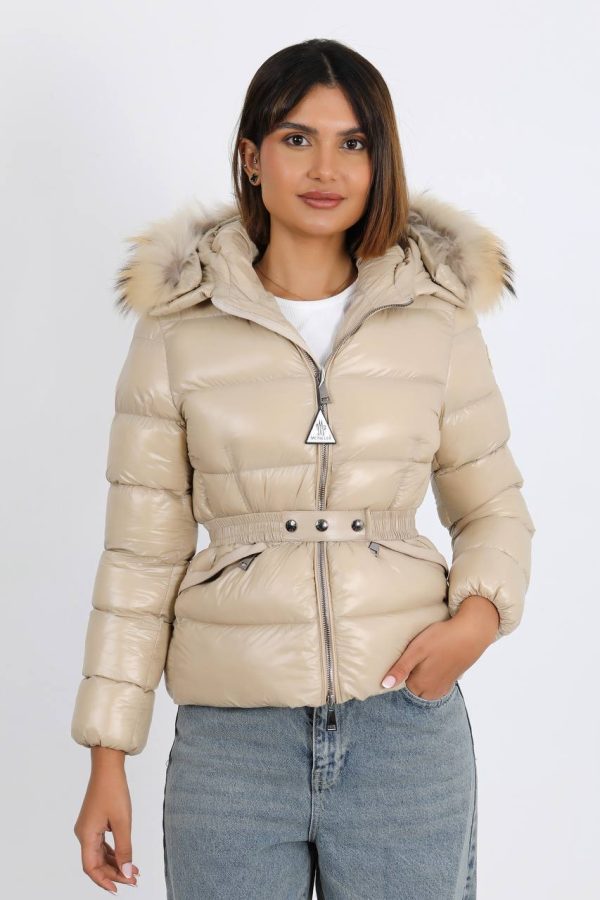 Moncler Kadin mont Kapusonu Tilki Tuyu Beli Kemer Detayli Yeni Sezon Bej Parlak