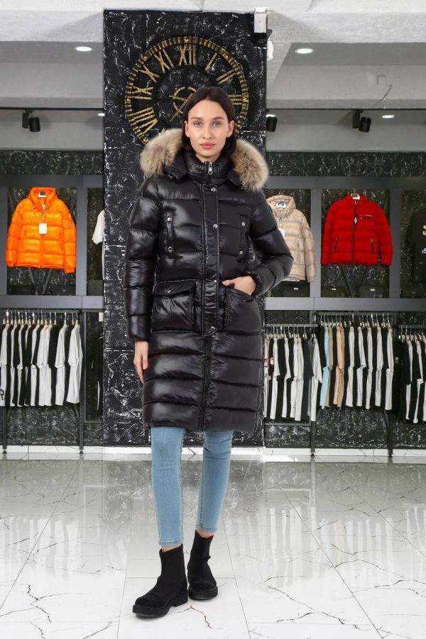 Moncler Kadin mont Kapusonu Tilki Tuyu Uzun Yeni Sezon Siyah Parlak