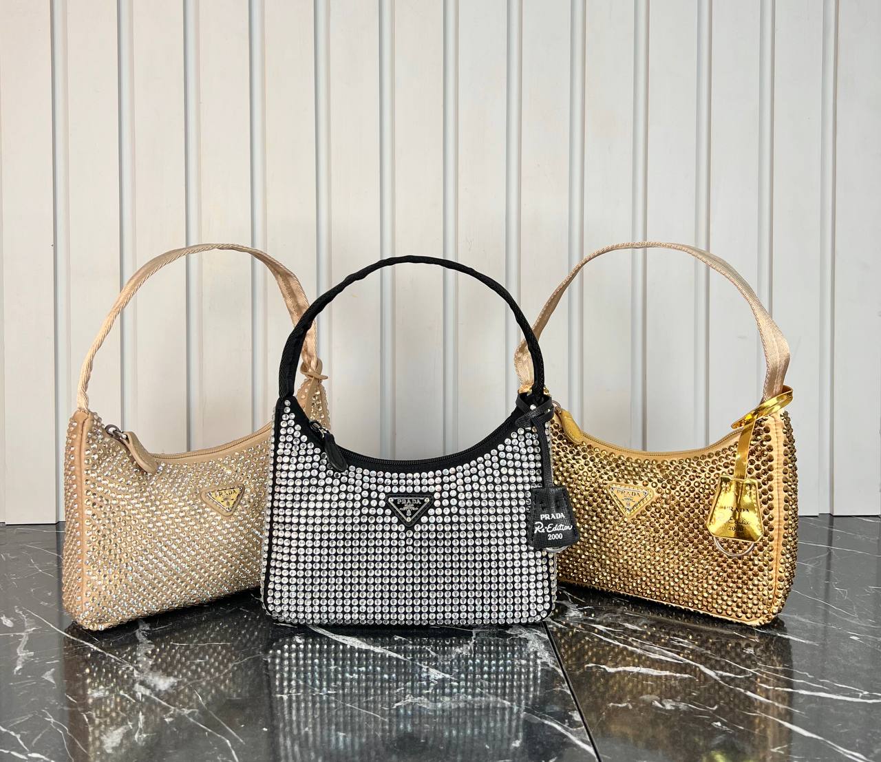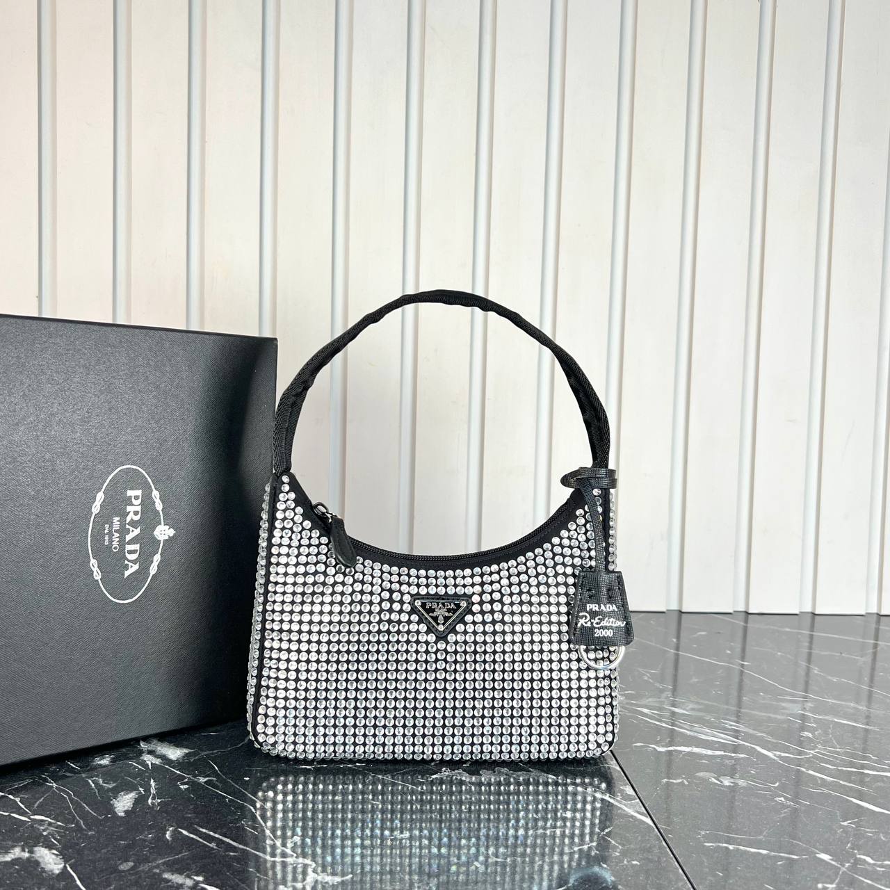 Prada Kadin canta Tasli Re Edition Satin Crystal Yeni Sezon Siyah