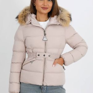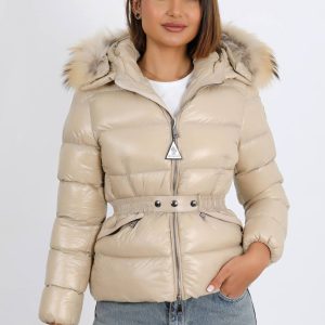 Moncler Kadin mont Kapusonu Tilki Tuyu Beli Kemer Detayli Yeni Sezon Bej Parlak