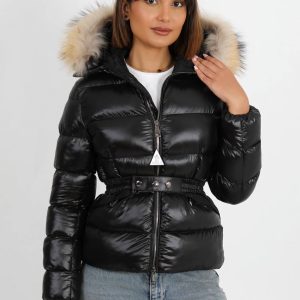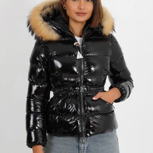 Moncler Kadin mont Kapusonu Tilki Tuyu Beli Kemer Detayli Yeni Sezon Siyah Parlak